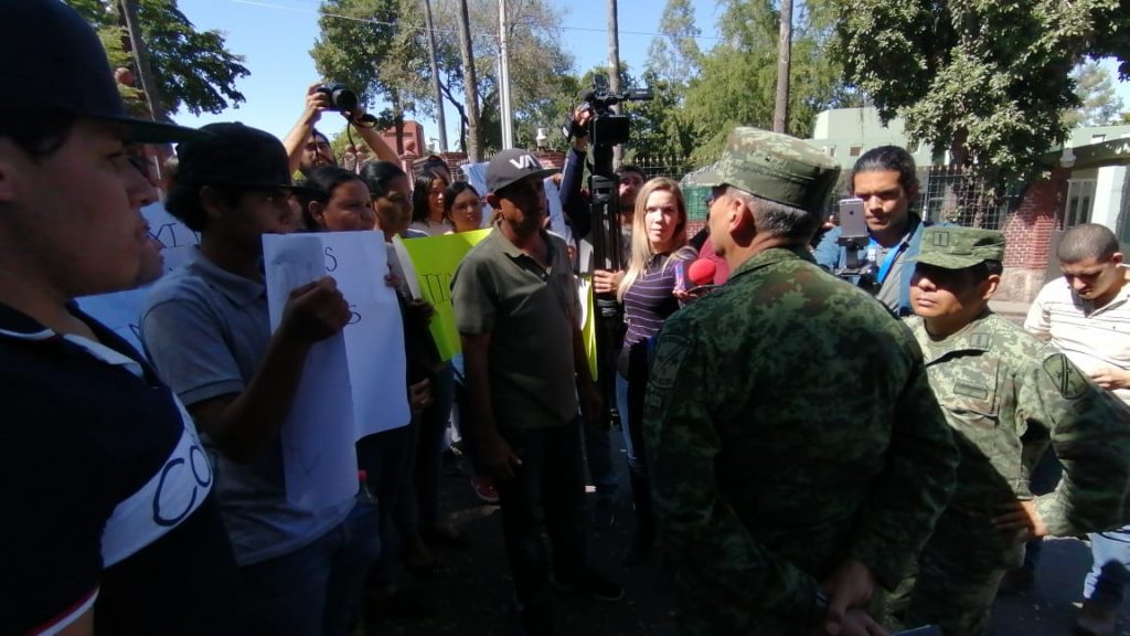 Con pancartas y a gritos exigían justicia para los presuntos responsables, los quejosos llegaron al cuartel, donde esperaban los recibiera alguna autoridad para exponer la situación y tener soluciones, ya que afirman que los militares fueron los que balacearon al joven de 22 años, quien actualmente se encuentra entre la vida y la muerte.