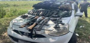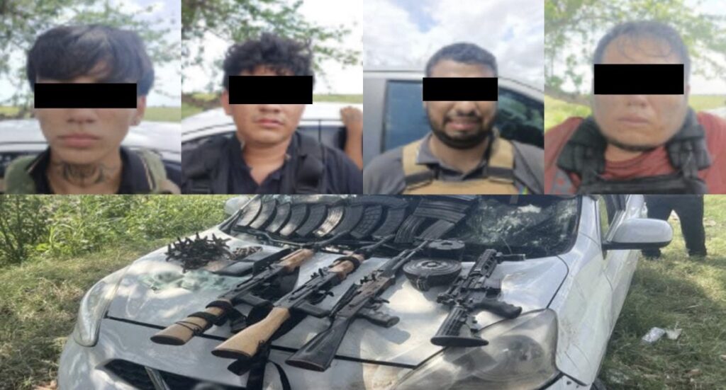 Durante rondines de seguridad, los agentes federales ubicaron a los sujetos y procedieron a su detención. Al inspeccionar el vehículo, encontraron rifles calibre 7.62 x 39 mm, conocidos como “Cuernos de Chivo” y “Cuernos de Disco”, así como equipo táctico, municiones, ponchallantas y droga.