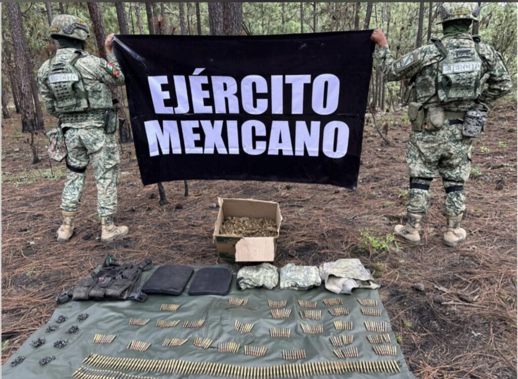Durante los trabajos de reconocimiento terrestre, el personal militar localizó 490 cartuchos de distintos calibres, un uniforme pixelado, una camisola táctica, dos placas balísticas, un chaleco táctico, un porta cargadores negro y 84 eslabones, además de dos kilogramos aproximadamente de hierba verde con características de la marihuana.